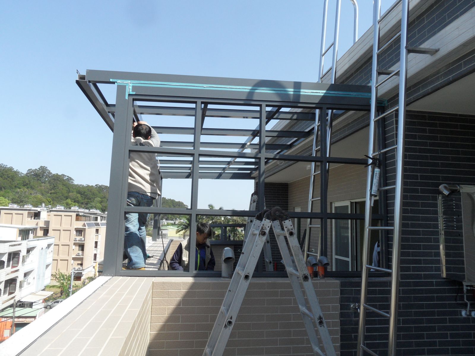 屋頂材質採用雙材質鋁+鋼,前置作業先將鋼管套入玻璃屋材料內