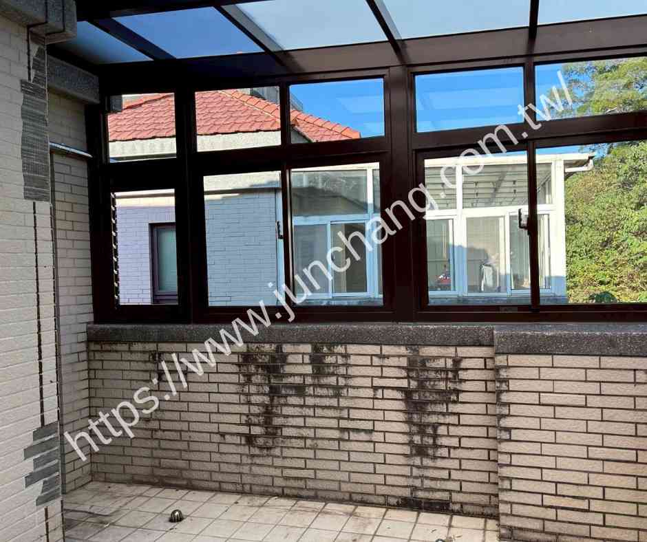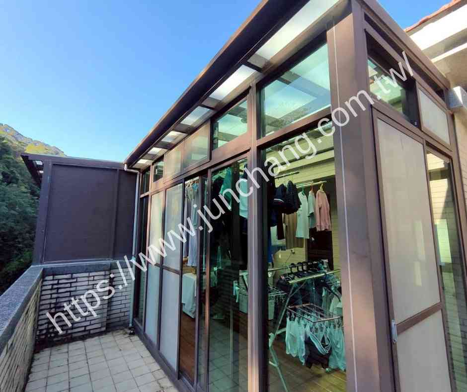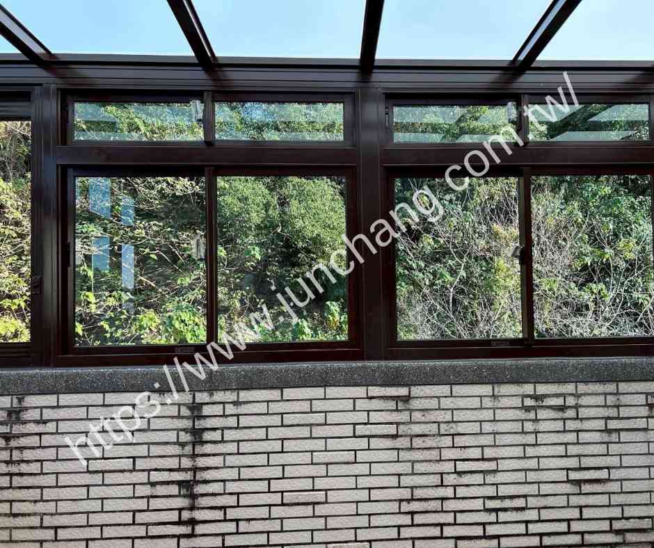 玻璃屋左側,左側靠牆一樘活動百葉,前方2樘氣密窗無氣窗